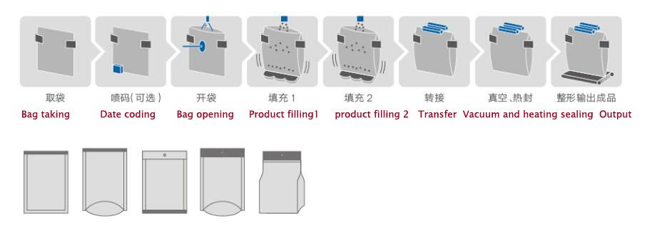 Жұмыс барысы: қаптау → басып шығару өндіріс күні → қапшықты ашу → толтыру 1 → толтыру 2 → бос орын → жылумен тығыздау → пішіндеу және шығару