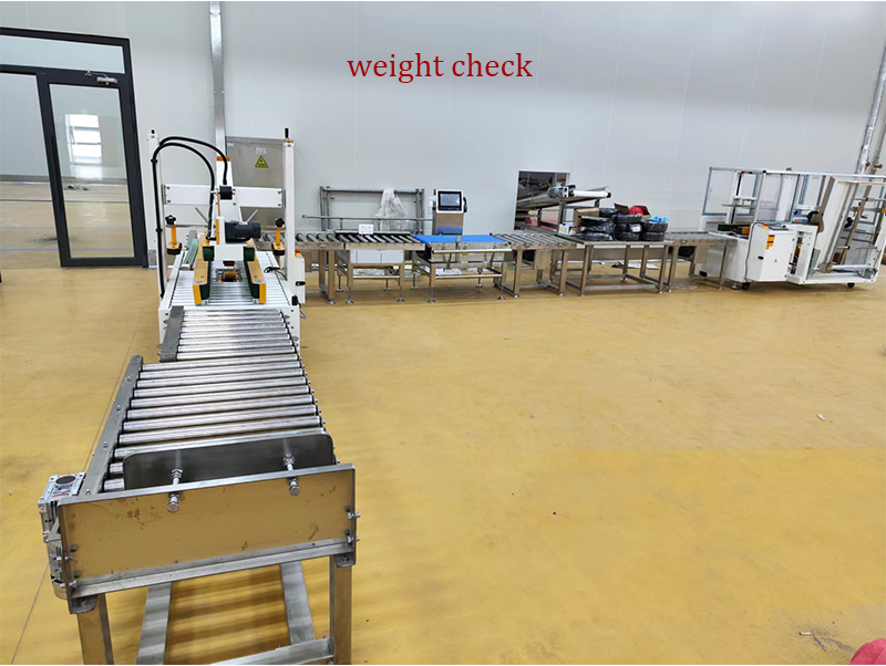 Қапшықтарды мұздатылған азық-түлікпен толтырғаннан кейін, салмақтың белгіленген салмаққа сәйкестігіне көз жеткізу үшін әрбір қап салмақ детекторымен қайта тексеріледі, содан кейін әрбір қапқа металл араласпау үшін металл детекторынан өтеді. Содан кейін қаптар картон құю желісіне тасымалданады.