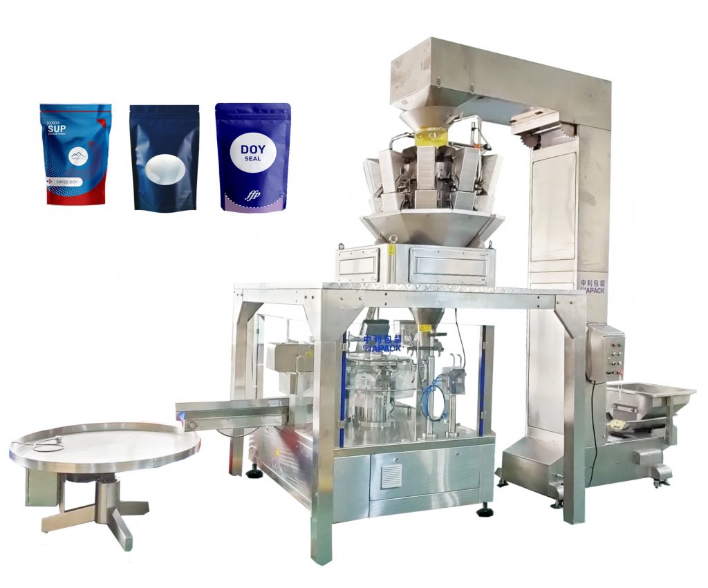 Тиімділігі мен тұрақтылығына арналған 8 жұмыс станциясынан тұратын алдын ала жасалынған қапшық толтырғыш және тығыздағыш машина, стендтік қаптың пакетін, найзағай қапшығын, қапшықты және әртүрлі алдын-ала жасалған сөмкелерді белгілейді. Әртүрлі мөлшерлеу жүйелерімен (аралас цемент / желілік өлшеуіш / бұрағыш / поршень толтырғышы) және автоматты көтергіш конвейерлермен тығыз байланыста жұмыс істейді, түйіршіктерге, сұйықтыққа және ұнтаққа кеңінен қолданылады.